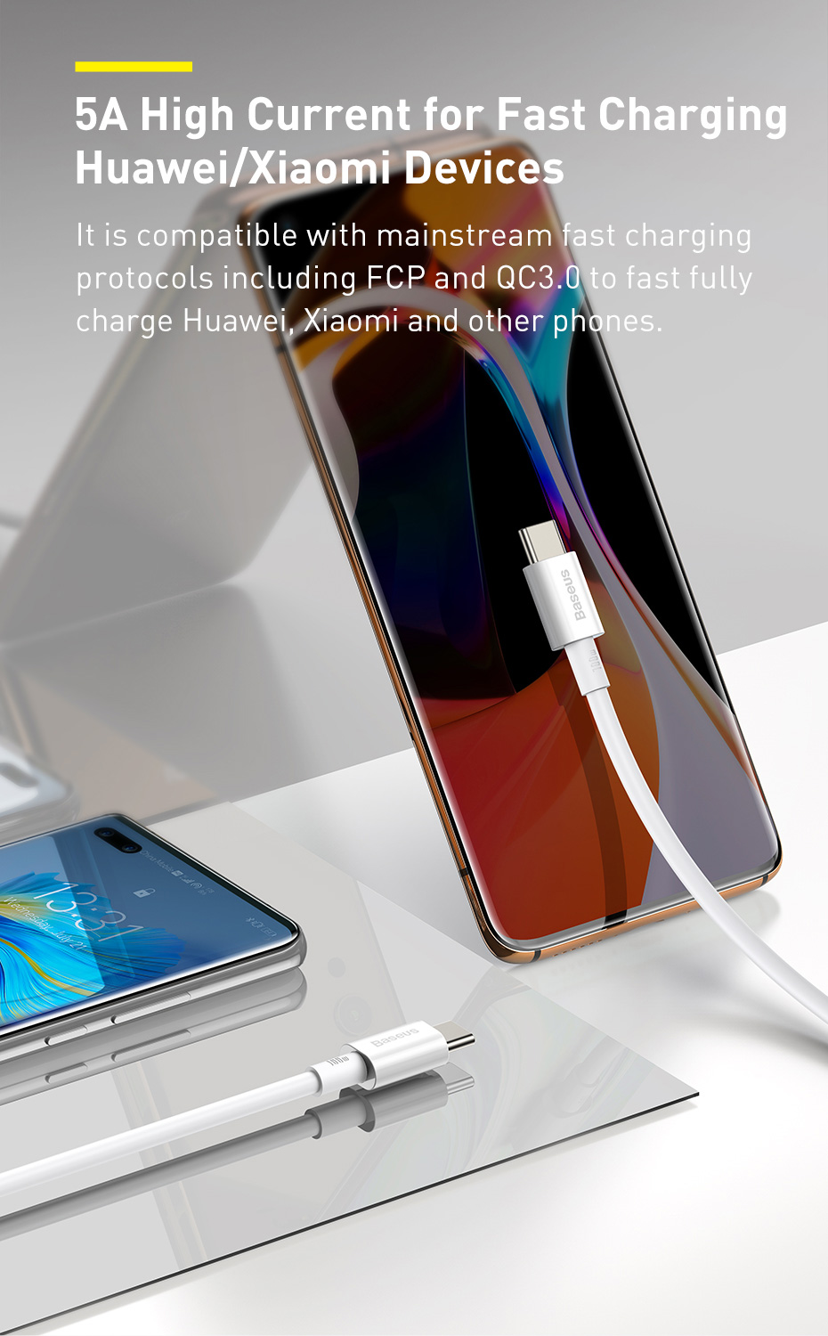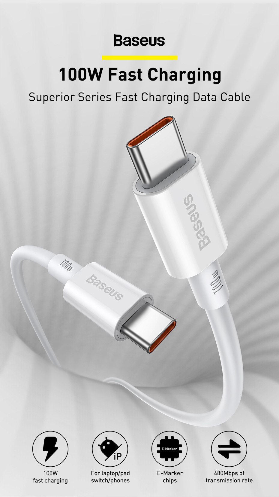 Baseus CATYS-C02 – 100W, USB Type-C to USB Type-C Fast Charging Data Cable, Cable Length:2m – White